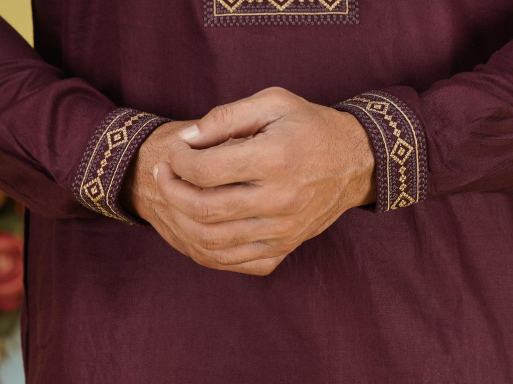 ✔️ হাতে এবং গলায় প্রিমিয়াম এম্ব্রয়ডারি কাজ করা হয়েছে, যা পাঞ্জাবিকে দেয় একদম ঈদের রাজকীয় লুক